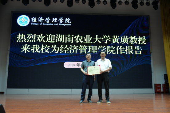 本次活动特邀请湖南农业大学二级教授、博士、博士生导师,现任联合国粮食计划署有机农业专家,国家粮油协同创新中心技术集成团队首席科学家、农业农村部长江中游作物栽培科学观察实验站站长、湖南省稻田生态种养协会会长黄璜教授为学院作《袁隆平精神》专题报告,学院总支书记程尚志向黄璜教授颁发“经济管理学院乡村振兴志愿服务品牌项目指导老师”聘书。