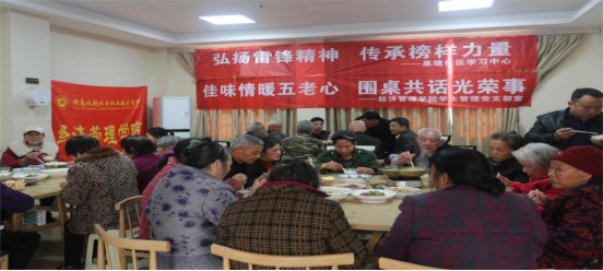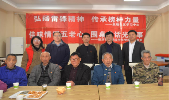 为深入贯彻落实习近平主席关于深入开展学雷锋活动的重要指示精神,让学雷锋在人民群众特别是青少年中蔚然成风,让学雷锋活动融入日常、化作经常,让雷锋精神在新时代绽放更加璀璨的光芒。3月5日,湖南水利水电职院经济管理学院学生管理党支部与泉塘社区学习中心联合开展了“佳味情暖‘五老’心 围桌共话光荣事”志愿服务活动。活动主要邀请了辖区德高望重的老党员、离退休的村干部及教师、退役老兵等齐聚社区居家养老服务中心,“五老”与经济管理学院二十余名师生围桌而坐,畅聊光荣往事,品学生现场制作的佳肴美味。