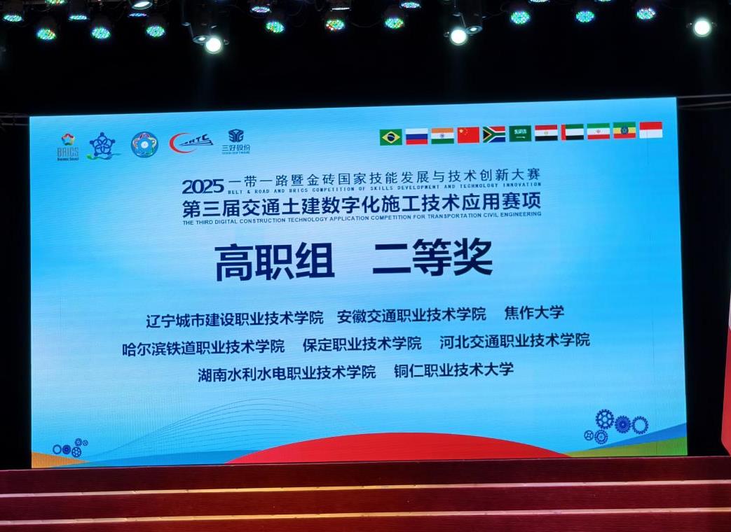 近日,2025一带一路暨金砖国家技能发展与技术创新大赛第三届交通土建数字化施工技术应用赛项决赛圆满闭幕,我校参赛团队凭借扎实的专业能力与出色的技术应用水平,一路过关斩将,最终斩获高职组交通土建赛道二等奖,为学校在国际技能赛事领域再添亮眼成果!