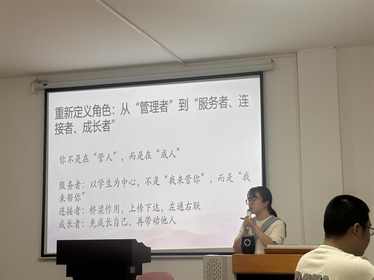 学院学生会负责老师也带来了《从优秀到卓越:学生干部的成长与担当》主题微讲座,为学生干部们厘清了角色认知。讲座中,老师引导学生思考作为“服务者”“连接者”与“成长者”的角色本质。同时,明确提出对干部“领导力、执行力、创新力、同理心”的四大能力期待。最后,还明确学院将从场地、资金、协调资源等方面提供全力支持,让新干部吃下“定心丸”,坚定干事创业的信心。
