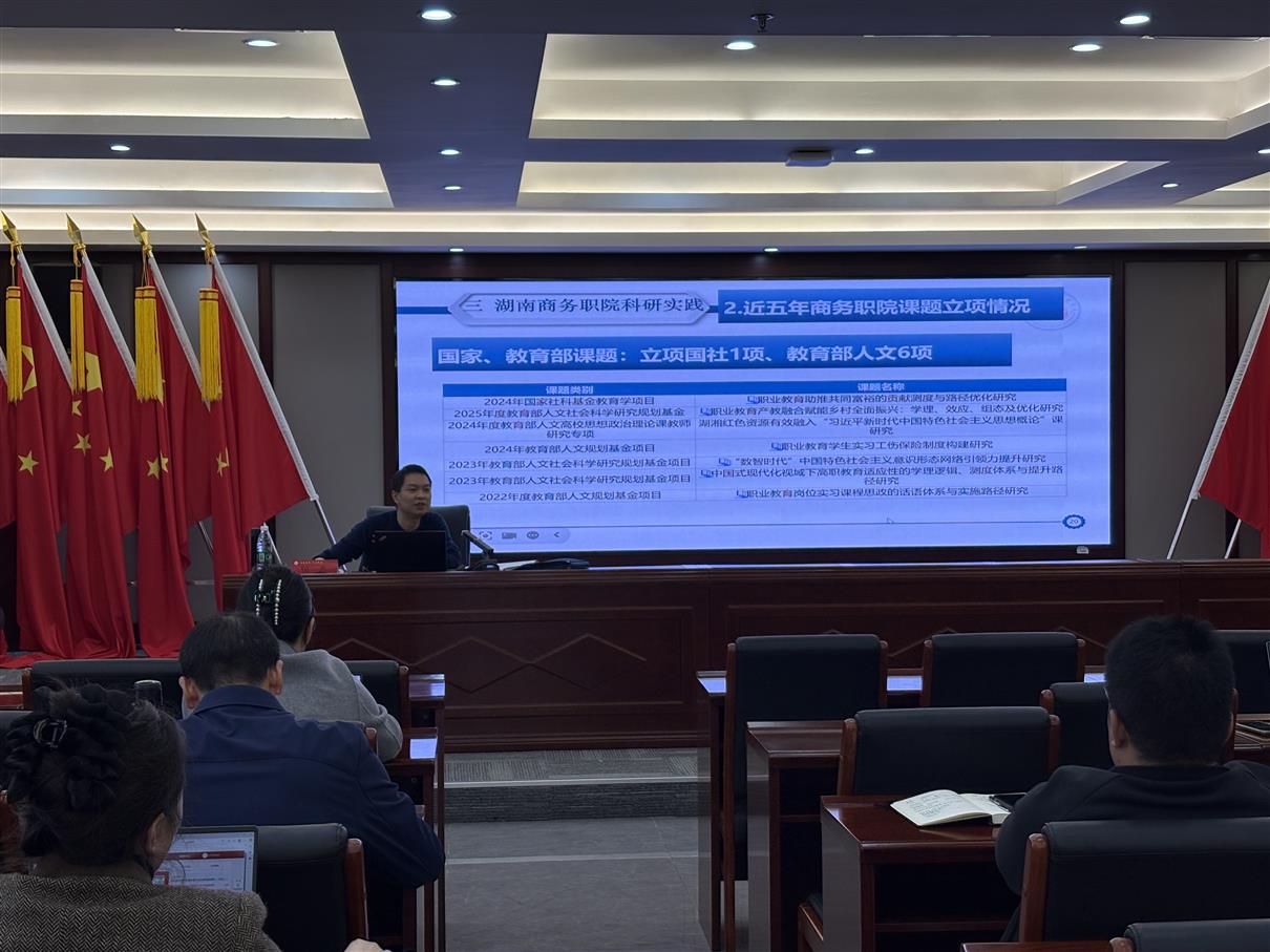 第二场讲座由湖南商务职业技术学院三级教授侯杰博士主讲,主题是《科学研究与课题申报》。侯杰博士结合自己担任科研处处长五年来在学校开展有组织科研以及建设科研团队的经验,系统阐述了高校科研的地位、类型、实践与申报策略。根据申报全国教育科学规划项目申报书活页内容着重从“什么是好的选题、选题常见问题、如何选题、课题命名”四个方面展开,提供了可借鉴的实用建议和实践路径。