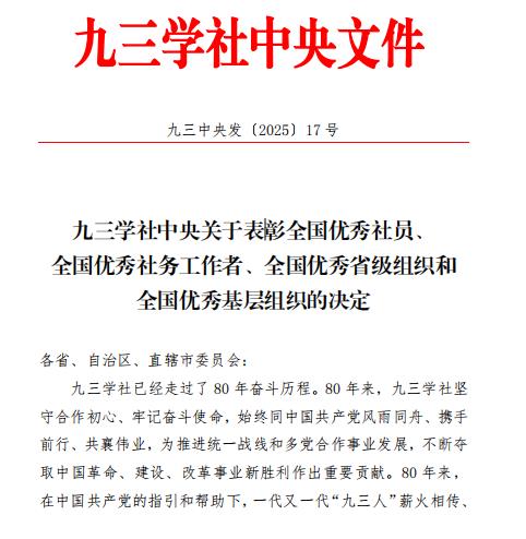学校九三支社社员荣获“全国优秀社务工作者”称号