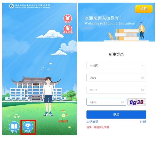 2.首先点选左下角的闯关,在弹窗中点选新生登录,输入学号和密码进行登录,初始密码是学号。