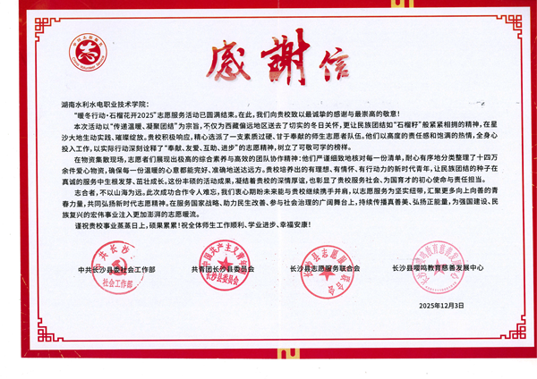 近日,“暖冬行动·石榴花开2025”志愿服务活动圆满落幕。中共长沙县委社会工作部、共青团长沙县委、长沙县志愿服务联合会、长沙县嘤鸣教育慈善发展中心联合向我校发来感谢信,对我校师生志愿者在此次活动中的突出表现予以高度肯定和诚挚感谢。
