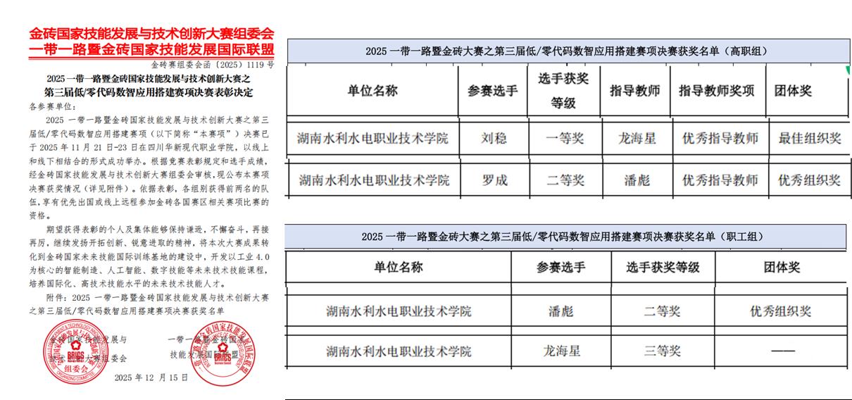 近日,我校师生在2025“一带一路”暨金砖国家技能发展与技术创新大赛——低/零代码数智应用搭建赛项全国总决赛中表现卓越,共斩获五项大奖,包括学生组全国一等奖、二等奖,职工组全国二等奖、三等奖,以及团体“最佳组织奖”。这一成绩实现了我校在该项国际高端赛事中的历史性突破,并为学校在国际高水准技能竞赛舞台上赢得了声誉。