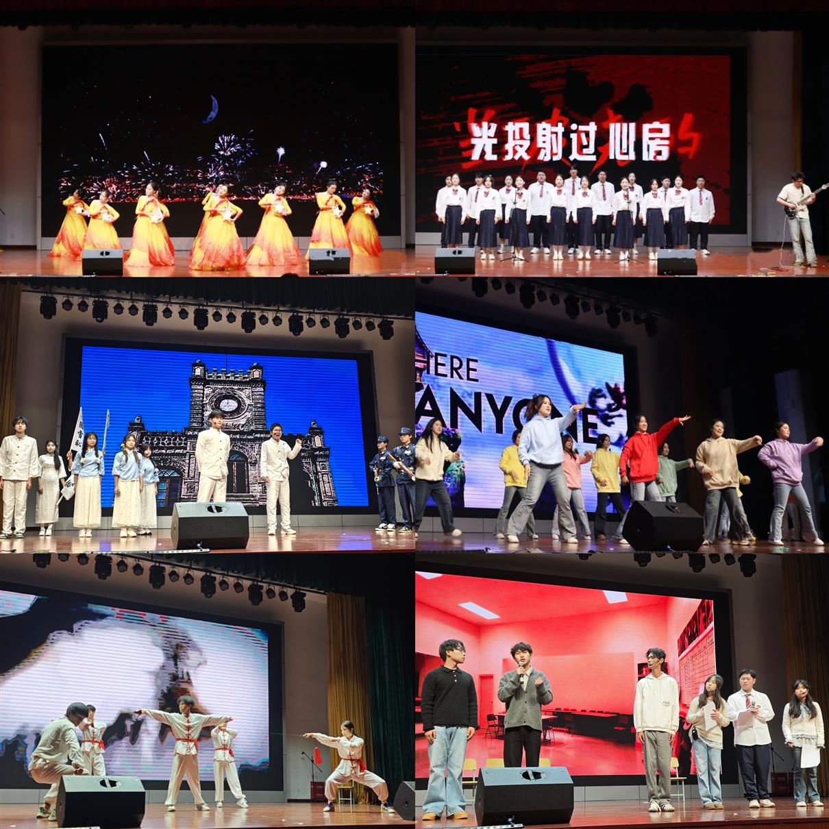 表彰环节后,一场由学生自编自演的文艺盛宴将气氛推向高潮。武术表演《武韵江山》刚柔并济,一招一式尽显中华传统文化底蕴;情景剧《来自1943的回响》穿越时空,以细腻演绎致敬革命先辈的理想信念;舞蹈《灯火里的中国》柔美深情,勾勒出新时代的繁荣图景;合唱《冲动》激情澎湃,唱出青年一代的朝气与梦想;话剧《破晓》构思精巧,生动再现了五四运动中青年学生为民族命运呐喊抗争的激昂场景;最后,第六届学生会委员带来的舞蹈《舞动青春》活力四射,展现了学生干部队伍的多才多艺与昂扬风貌。这些源于生活、贴近实际的原创作品,不仅展示了电力学子的艺术才华,更折射出他们积极向上的精神风貌和深沉的家国情怀。