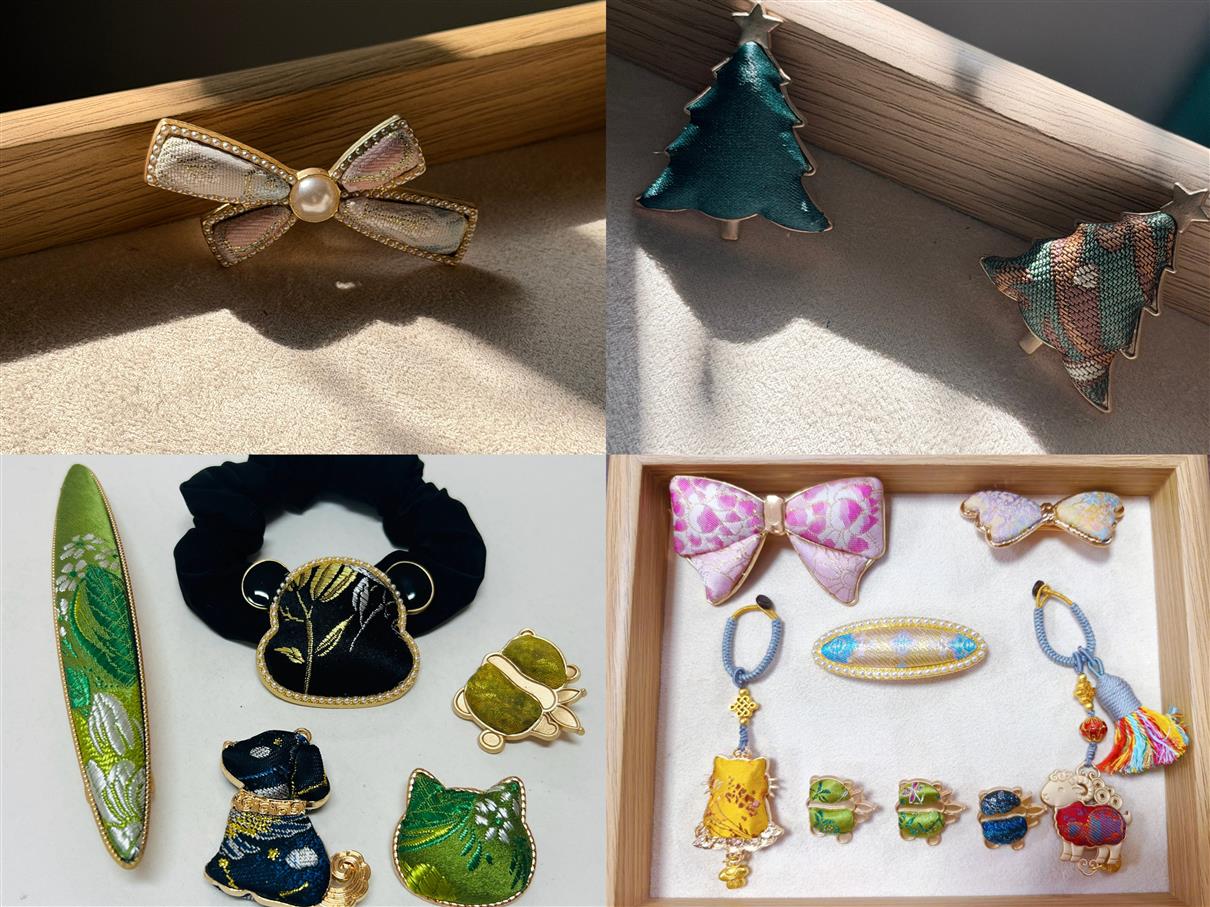 活动现场,女职工们围坐成圈,桌上整齐摆放着宋锦面料、配饰配件与针线工具。“先固定锦布位置,再顺着纹样边缘穿针,注意线迹要均匀……”巧手慧心工作室刘丹老师团队一边示范,一边耐心讲解宋锦胸针、发卡、挂件的制作要点。大家听得认真、练得专注,穿针引线时屏气凝神,遇到难题时互相请教,指尖翻飞间,原本零散的宋锦面料渐渐变成了精致的挂件、雅致的发卡与精巧的胸针。“平时伏案工作久了,这样动手做手工特别放松,还能感受到传统工艺的美!”现场一位女职工笑着说道,温馨的互动让整个沙龙充满了暖意。
