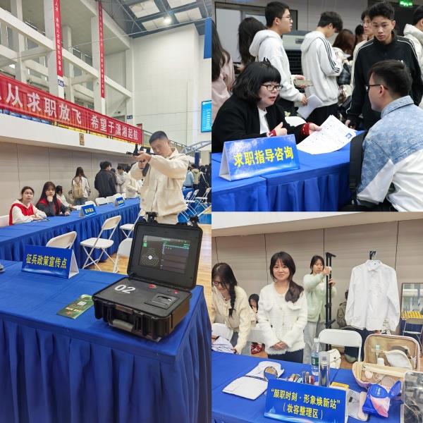 招聘会不仅服务本校毕业生,也吸引了兄弟院校学生前来参与,提升了招聘会的社会影响力。“我得知水电职院要办大型招聘会,岗位质量高,就和同学一起过来了。”来自湖南安全技术职业学院计算机专业的廖喆俊同学在招聘会现场表示,“招聘企业类型丰富,现场氛围也很好,我已经投递了几份简历,希望能收到企业的回复。”与往年相比,本次招聘会在就业服务上实现多项创新升级,打造“求职应聘+职业指导+特色体验”三位一体的就业服务新模式。职业形象“一站打造”。学校首次在会场设置“颜职时刻·形象焕新站”,由学生朋辈志愿者担任形象顾问,并配备衬衫、简易化妆品、梳子、穿衣镜、针线包、别针等物品,为毕业生提供面试前仪容整理与职业形象指导,帮助大家以最佳状态迎接面试。国防教育“沉浸体验”。会场设置征兵政策宣传点,并引入模拟打靶体验区,将国防教育与就业服务有机结合。学生在应聘之余可参与模拟射击体验,现场了解大学生入伍政策,激发青年学子参军报国热情。据统计,当天共有200余名学生咨询入伍政策,30余人表达强烈参军意愿。就业指导“精准滴灌”。会场设立求职指导咨询站,邀请就业指导教师提供简历诊断、面试技巧辅导、职业规划咨询等一对一帮扶,累计服务学生100余人次。