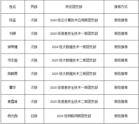 经各班级团支部推荐、学院团总支审查,拟推荐段玺等8名同学为团员发展名单,特进行公示: